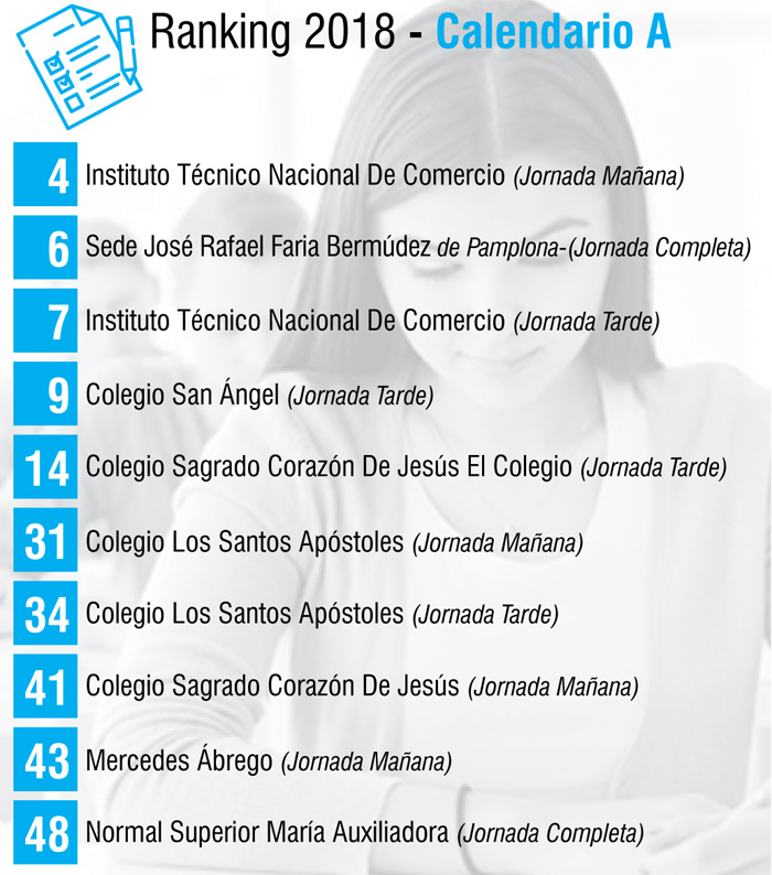 En esta oportunidad, el Instituto Técnico Nacional de Comercio, los colegios Santo Ángel, Sagrado Corazón de Jesús (jornada tarde) y José Rafael Faría Bermúdez de Pamplona se destacaron por sus buenos promedios, entre 9.029 instituciones que se presentaron.