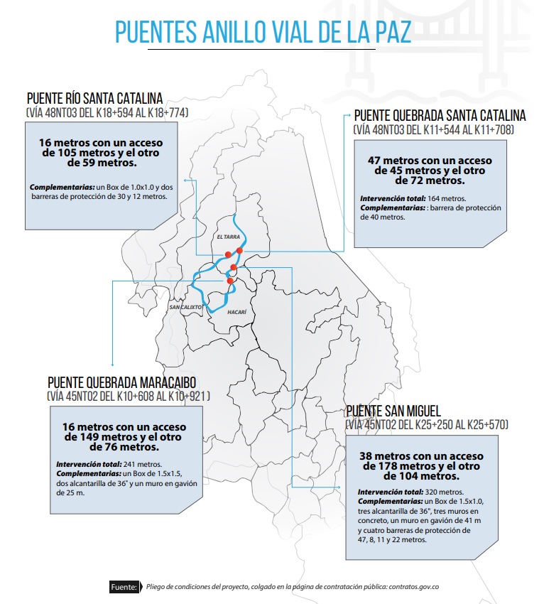 Los puentes a intervenir serán: quebrada Maracaibo, allí se intervendrán 241 metros; quebrada Santa Catalina, con 164 metros de intervención; río Santa Catalina, con 180 metros; y San Miguel, con 320metros.