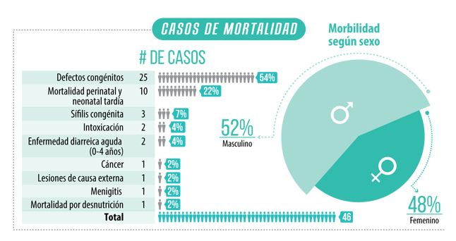 Entre 2009 y 2014 las principales causas de mortalidad infantil y en la niñez, se originaban en el periodo perinatal; en segundo lugar, estaban las malformaciones congénitas, con una tasa de 57 por cada 100.000 menores de 5 años en 2014, condiciones que, a la fecha, siguen ocupando los primeros lugares.