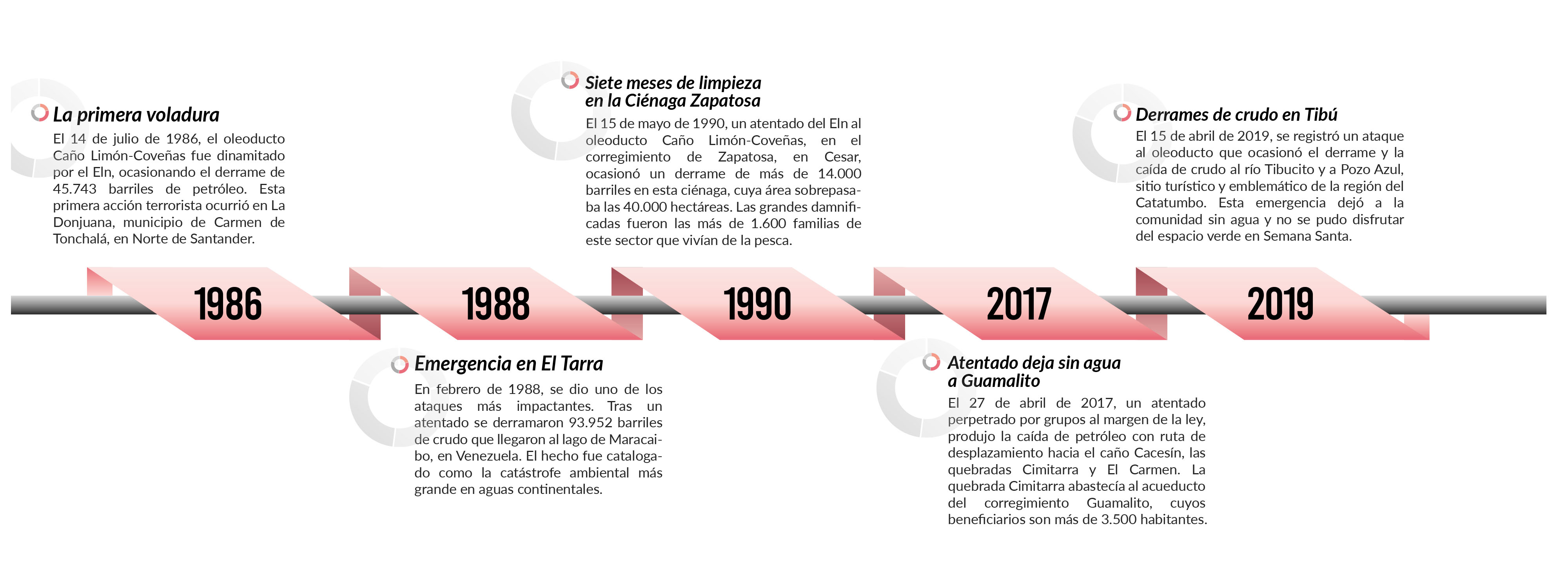En más de 33 años de operaciones del oleoducto Caño Limón-Coveñas, la infraestructura se ha visto afectada por más de 1.500 acciones delictivas (atentados y válvulas ilícitas). Se han derramado más de 4 millones de barriles de petróleo.