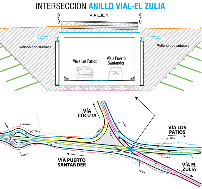 Gutiérrez explicó que en esta intersección se requiere pasar el anillo vial completamente por debajo de la vía El Zulia, con cuatro conectantes, que permitan la circulación hacia Los Patios, Puerto Santander, Cúcuta y El Zulia.