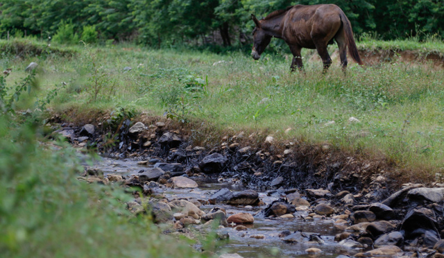 A pesar de las labores de limpieza, el tornasolado en algunas partes de la cañada y sus orillas negras son el reflejo del daño irreparable. Los animales que pastan alrededor de ella también son muestra de lo ocurrido: parecen untados de fango negro.