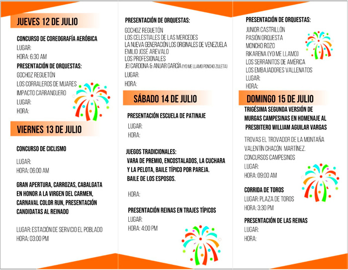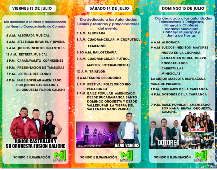 Este jueves 12 de julio inicia la programación en este municipio, donde tendrán concurso de coreografía aeróbica, carrozas, cabalgata, juegos tradicionales, presentación de reinas, corrida de toros, show cómico taurino, festival de orquestas y la presentación de Karen Lizarazo y Los Dotores de la Carranga.