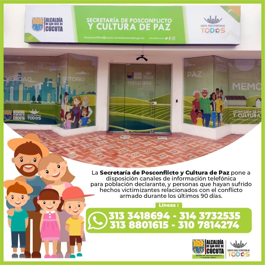 De igual forma, la Secretaría de Posconflicto y Cultura de Paz anunció el cierre de atención presencial en las oficinas, por eso dispone de estas lineas telefónicas y de WhatsApp como canales de comunicación para toda la población víctima del conflicto armado que haya sufrido hechos victimizantes (ocurridos durante los últimos 90 días), que requiera solicitar componentes de Ayuda Humanitaria Inmediata y ya haya declarado en la Personería o Defensoría del Pueblo.