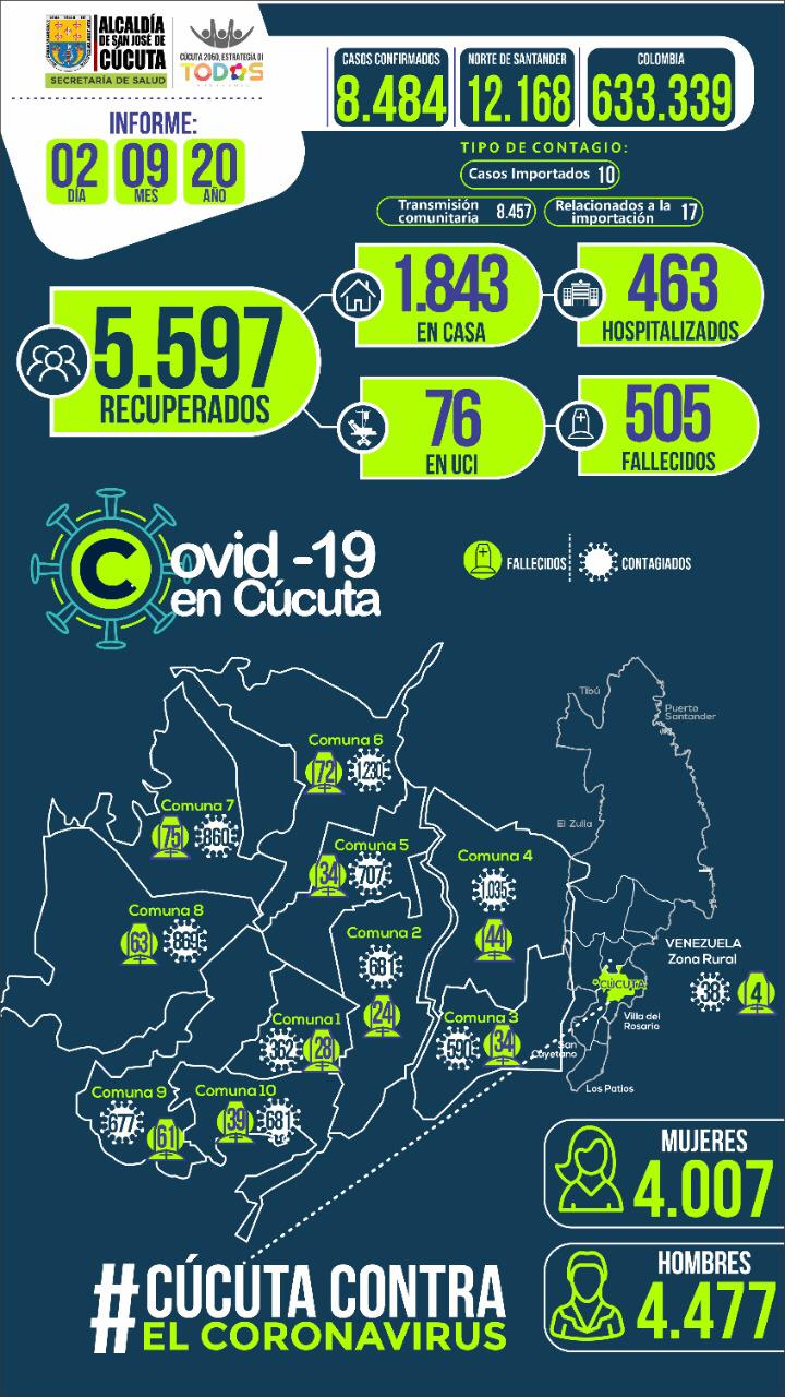Cúcuta acumula 8.484 contagios de coronavirus, tras el reporte de este miércoles del Ministerio de Salud, el cual indicó que en Norte de Santander se registraron 121 en 24 horas, 76 de ellos en el municipio.