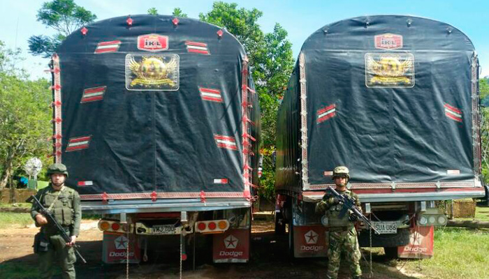 En El Tarra, uniformados de la Policía y tropas del Ejército interceptaron dos camiones que transportaban 17.500 kilos de cemento, 3.000 kilos de sulfato de amonio, 4.000 kilos de abono mineral (conocido como triple 15), y 10.000 kilos de urea.