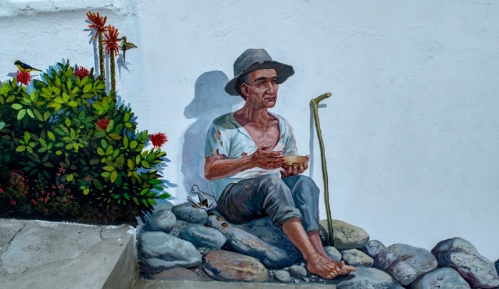 Con esta pintura recuerdan la época en que no había carretera y el camino real era el único acceso al casco urbano, por lo que los mendigos se peleaban la parte alta para estacionarse.