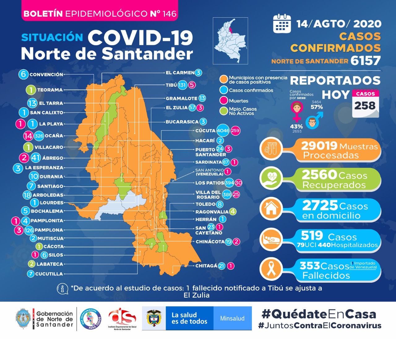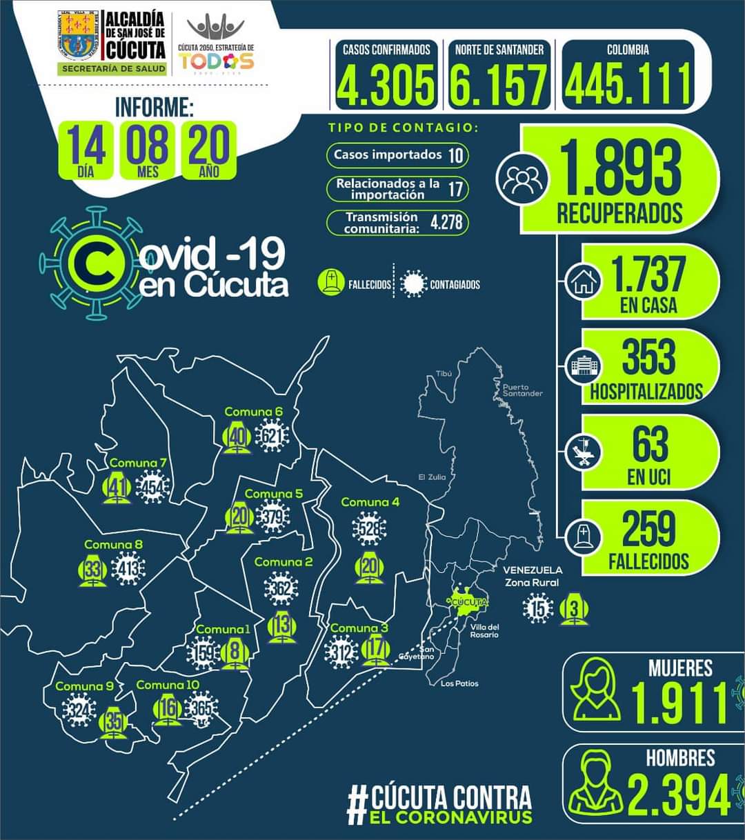 La Alcaldía de Cúcuta precisó que el municipio contabiliza 4.305 contagios y 250 defunciones. Hay 353 pacientes hospitalizados, 63 en Unidad de Cuidados Intensivos (UCI) y 1737 aislados en sus casas. Van 1.893 recuperados.