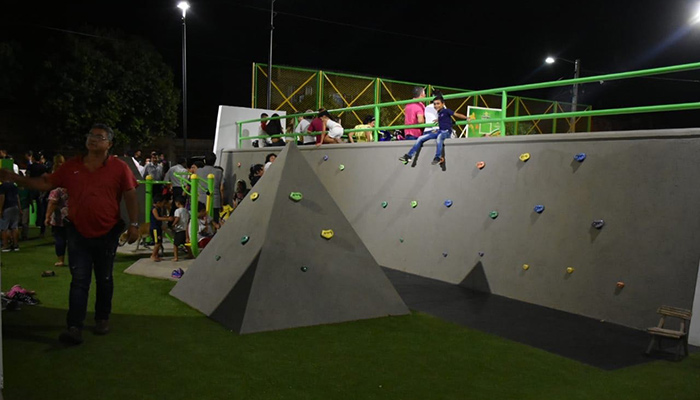 Esta obra cuenta con un moderno módulo de skate, zonas de juegos infantiles, graderías, cinearte, cancha multifuncional, muros para escalar, rampas de acceso para personas en condición de discapacidad y luces en led.
