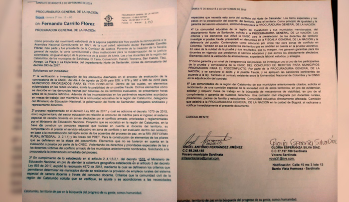Los maestros de Sardinata interpusieron un derecho de petición ante la Procuraduría General de la Nación.
