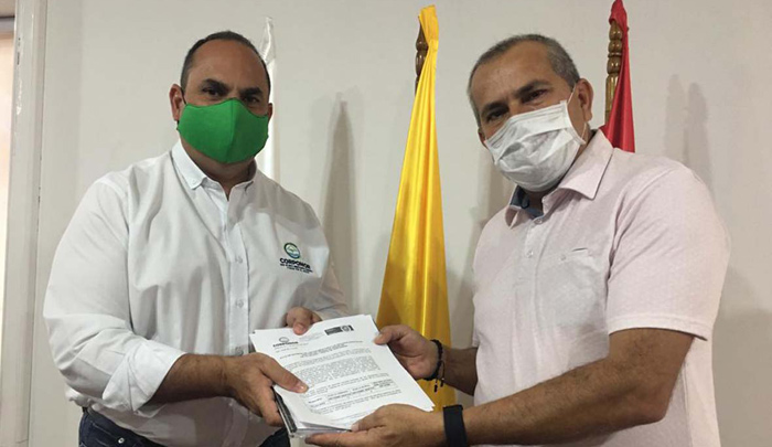 (El director de Corponor, Gregorio Angarita hace entrega de los estudios a Carlos Daniel Serrano, alcalde de Villa Caro.)