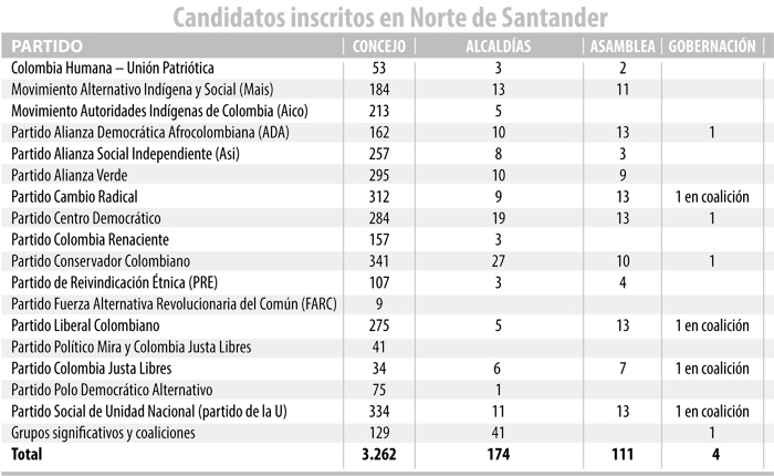 La Registraduría dio a conocer la cifra final de candidatos que quedaron inscritos para aspirar a los diferentes cargos de elección popular, el 27 de octubre. En Norte de Santander, de 4.073 que inicialmente se habían postulado, quedaron 3.997, registrándose una reducción de 76 aspirantes.