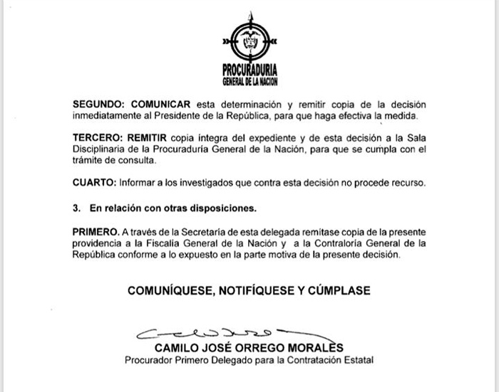 La Procuraduría también encontró méritos para abrir una investigación contra el mandatario y Mayret Zoraida Niño Moreno, representate legal de Niu Telco, con quien se establecerá la existencia de presuntas faltas disciplinarias ante una posible vulneración del ordenamiento jurídico y supuestas irregularidades en la formación, adjudicación y celebración del contrato interadministrativo No. 00740 del 22 de marzo de 2019.