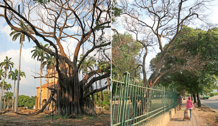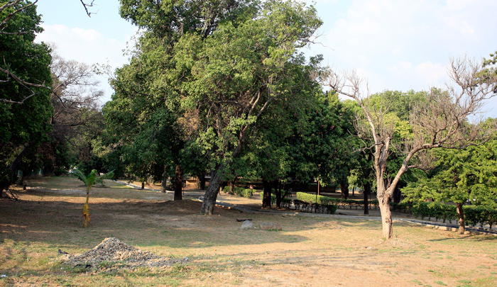 Del gigantesco árbol de caucho, a un costado de la capilla, solo queda leña seca que amenaza a quienes visitan el parque y otro árbol se extiende hasta los alrededores de la casa. }+