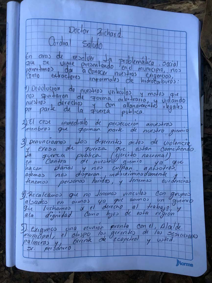 Entre las exigencias se incluía la devolución de los vehículos y motocicletas que fueron incautados por la fuerza pública, que cesara la persecución a los miembros que forman parte de los extractores informales de hidrocarburos, como ellos se identifican en el texto, y solicitaron una reunión con representantes del gobierno local, Ecopetrol, la Personería y la iglesia.