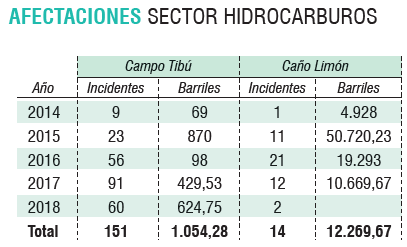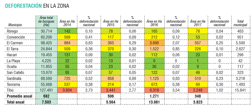 Sin embargo, también el trabajo agrícola ha afectado este suelo. En Tibú el mayor porcentaje de deforestación se atribuye a áreas agrícolas heterogéneas y pastos. Lo mismo ocurre con los hidrocarburos, pues en el 2017, indica Corponor, se identificaron 36 instalaciones fraudulentas, y durante este año ya se han identificado y retirado 592 válvulas ilícitas en la línea de campo Tibú.