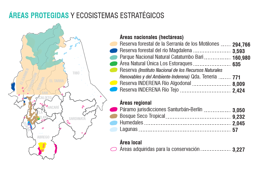 Son 1.133.599 hectáreas que representan el 52 por ciento del territorio del departamento, con siete cuencas de agua dulce y un 60 por ciento de zona altamente montañosa. Esta zona cuenta con 112 humedales en un área de 238 hectáreas, distribuidos en 18 veredas en los municipios de Tibú y Sardinata.