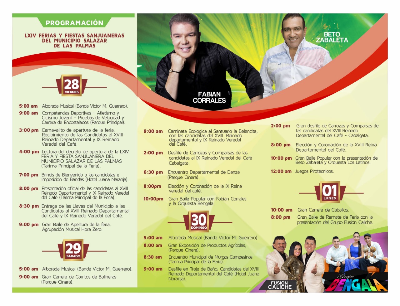 Dentro de las jornadas se contemplan el Reinado Veredal y Departamental del Café, las comparsas, el desfile de carrozas, las cabalgatas, la exposición de productos agrícolas, el festival de murgas, la carrera de caballos, los encuentros deportivos y folclóricos y los shows musicales.