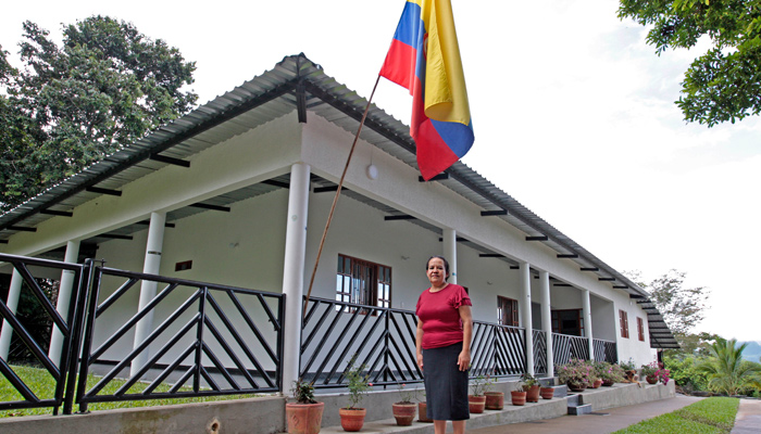 Jaimes ha vivido por más de 46 años en la vereda, es una mujer emprendedora que ha logrado salir adelante con su familia compuesta por siete hijos. Su predio Campo Alegre es trabajado con un proyecto piscícola, ganadería y cultivos de cacao y maíz.