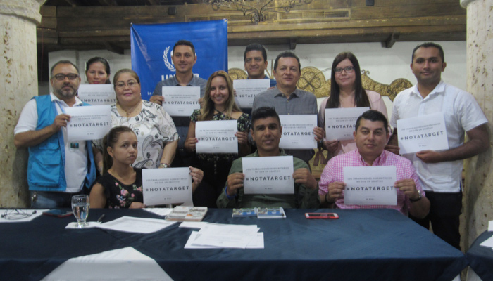 (La Asociación de Personeros del Catatumbo por fin pudo efectuar su asamblea, aplazada por el conflicto, y acompañada por Acnur y Ocha. En la imagen, exhiben un mensaje: No soy un objetivo.)