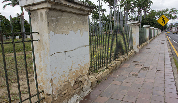Las rejas que encierran el parque histórico están oxidadas, caídas y al borde de tener que sostenerse con alambres. Las paredes que deberían ser blancas se encuentran descascaradas, sucias y agrietadas.