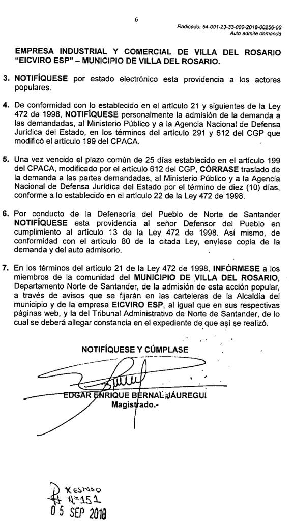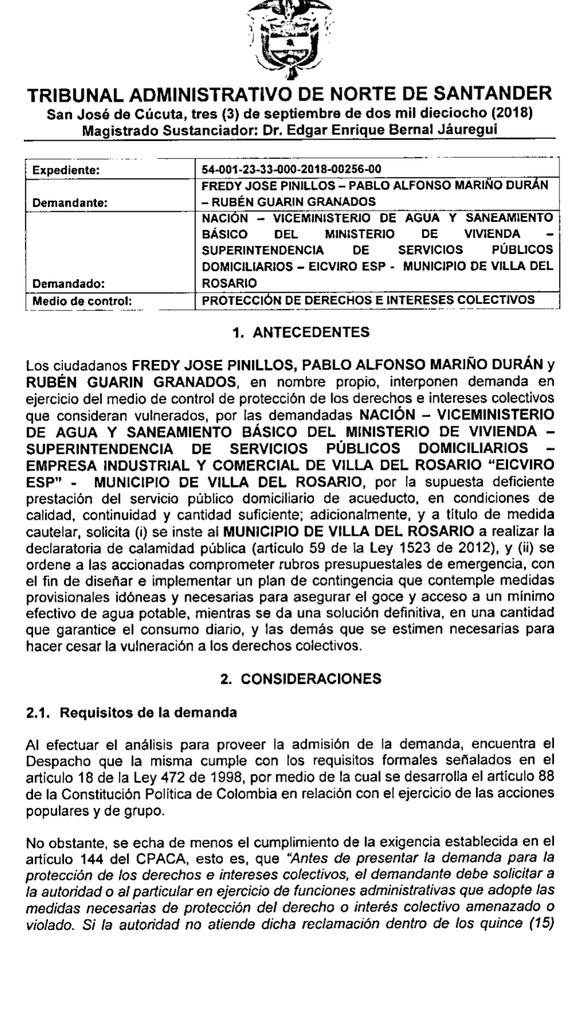 El magistrado Édgar Enrique Bernal, del Tribunal Administrativo de Norte de Santander, admitió la solicitud de Fredy José Pinillos, Pablo Alfonso Mariño y Rubén Guarín, quienes exigen que se inste a la Alcaldía de Villa del Rosario a declarar la calamidad pública.