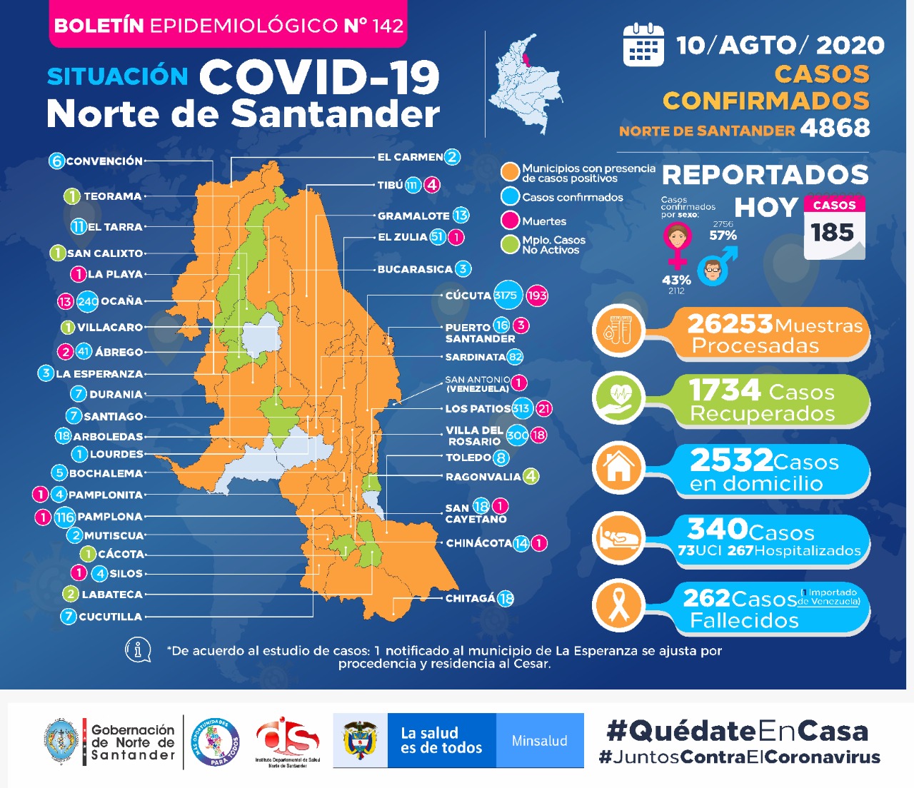 Norte de Santander sumó otros 185 casos de coronavirus, para un total de 4.868, luego del informe entregado este lunes por el Ministerio de de Salud, el cual también indicó que se registraron 17 fallecidos, llegando a 262 víctimas mortales.