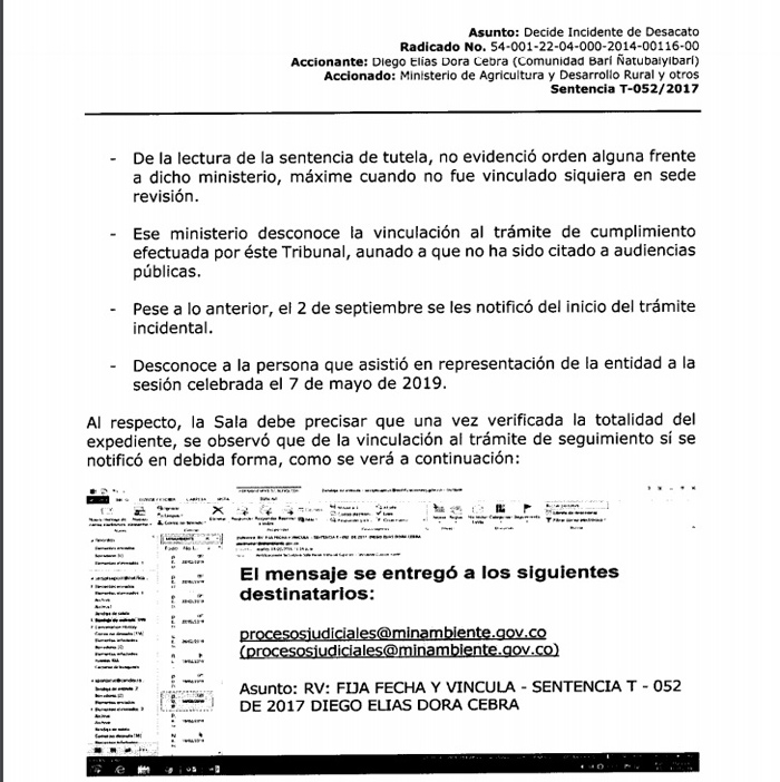 Este es el facsímil del auto del Tribunal Superior de Cúcuta que presenta las pruebas para demostrar el incumplimiento del Gobierno Nacional en este tema. La instancia judicial ordenó 10 días de arresto y un pago de una multa de 5 salarios mínimos a Claudia Adalgiza Arias Cuadros,jefe de la Oficina Jurídica del MinAmbiente.