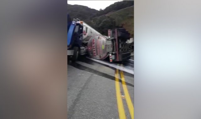 Tras un deslizamiento quedó atrapado un camión cisterna.