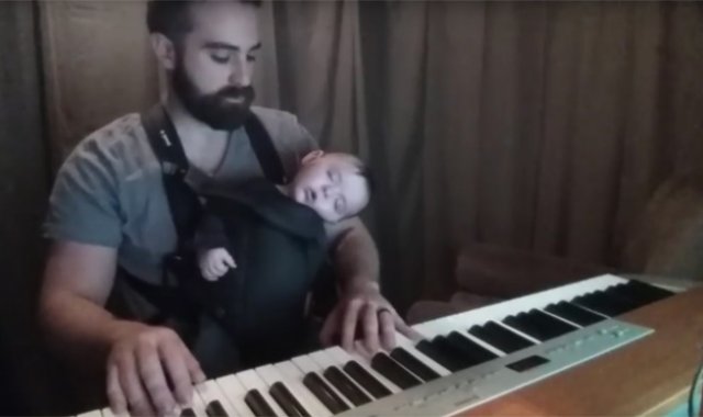 Papá duerme a su bebé tocando una canción de cuna en piano
