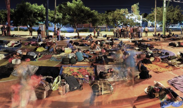 Tres soldados venezolanos desertores duermen con otros en una cancha