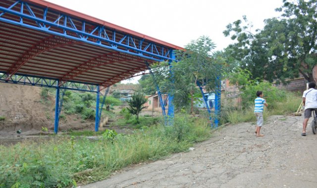La construcción del polideportivo está parada desde octubre y la calle adyacente se desmorona por falta de un muro.