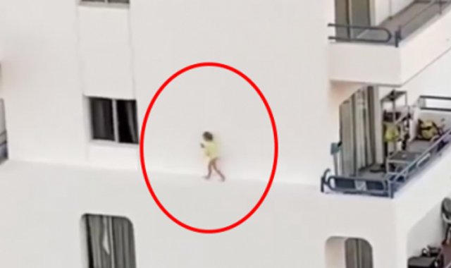 Desde otra torre, fue captado el momento en el que la pequeña se desplaza desde una ventana al balcón, a una altura de 10 metros.