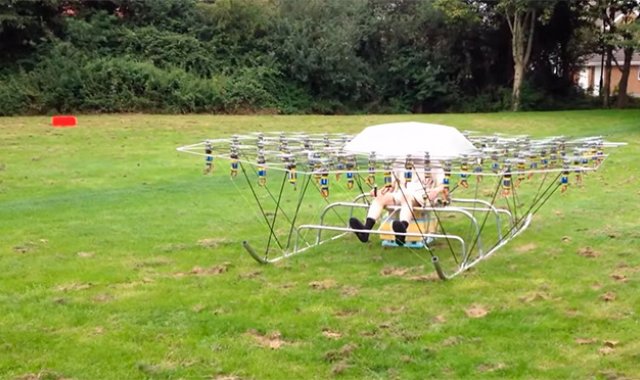 El hombre utilizó 54 hélices con una batería cada una para poder elevar la estructura.