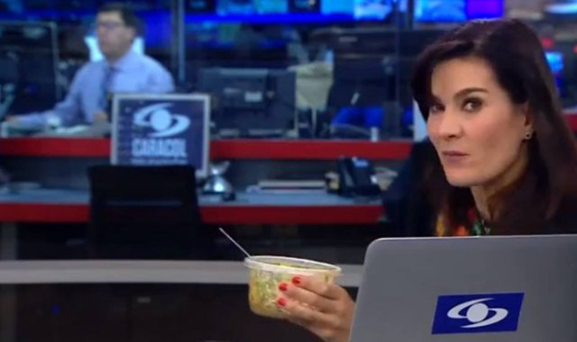 La presentadora de noticias fue sorprendida al aire mientras comía y hablaba por teléfono.