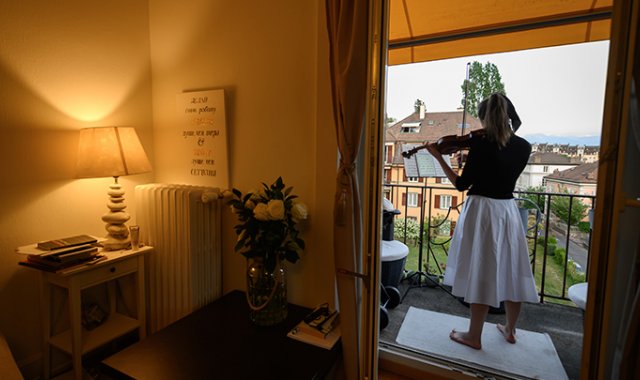 La violinista Alexandra Conunova "salva almas" desde su balcón en Suiza