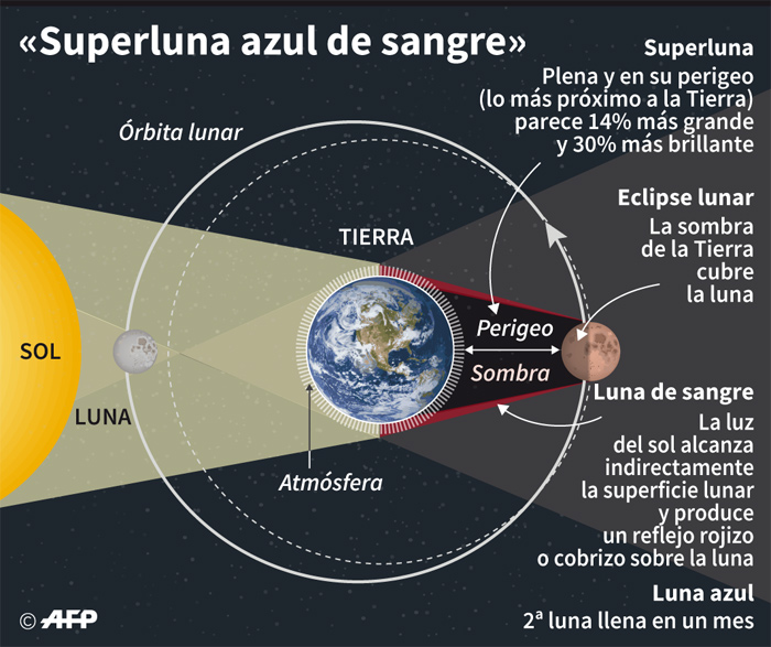 Los habitantes de gran parte del planeta apreciarán este 31 de enero un eclipse total de la llamada ‘Superluna azul’, la segunda luna llena del mes y en su posición más cercana a la Tierra.