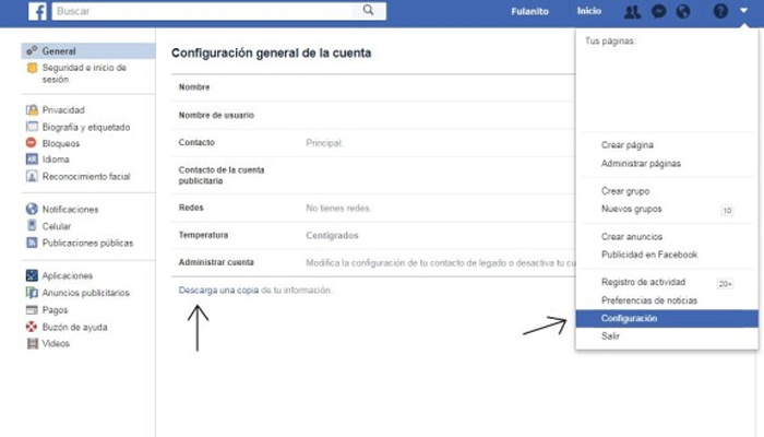 ¿Cree que estamos exagerando? Puede comprobar lo que Facebook sabe de usted en la pestaña General del menú Configuración. Al final hay un enlace que dice Descarga una copia de tu información. Haciendo clic ahí puede solicitar todos los archivos que la red social guarda en su cuenta, desde el mismo momento en que fue creada. Le enviarán una carpeta comprimida a su correo electrónico.