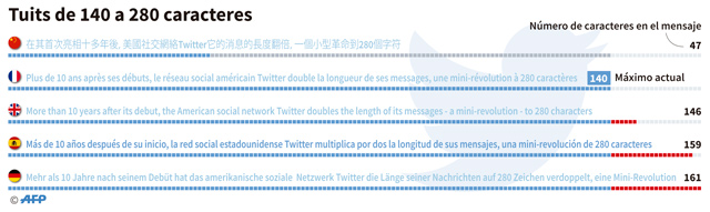 La extensión solo concierne a los tuits en caracteres latinos, aclara la red, porque es sobre todo en inglés, español, portugués y francés que el límite de 140 caracteres parece a veces causar preocupación en los usuarios, a diferencia de aquéllos que tuitean en japonés, coreano o chino.