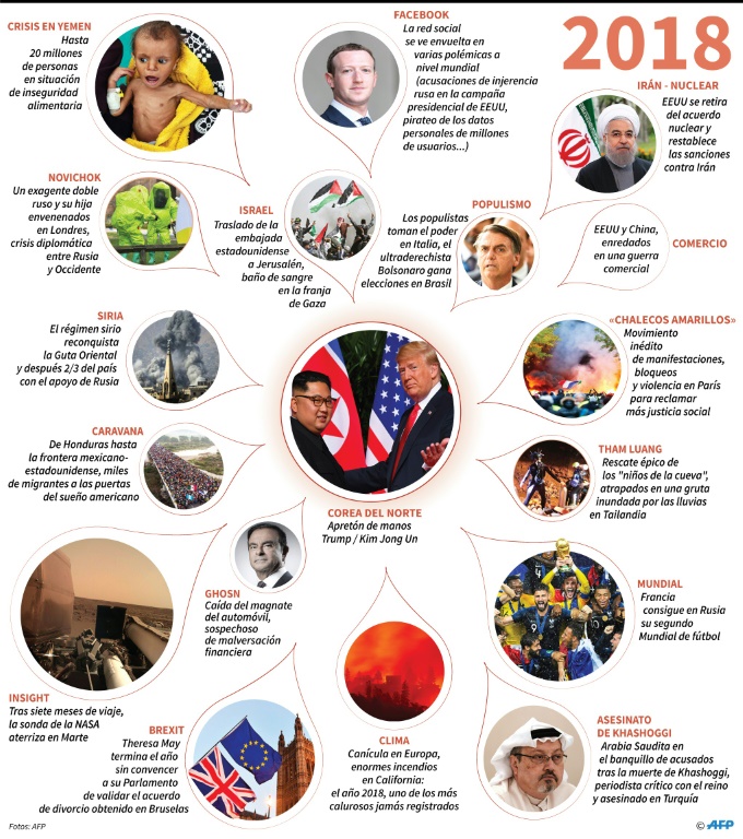 El año 2018 estuvo marcado por la agravación de numerosas crisis y el surgimiento de nuevas tormentas, entre el ascenso de los populismos, la creciente preocupación por el clima, el Brexit y movilizaciones como la de los "chalecos amarillos" en Francia.