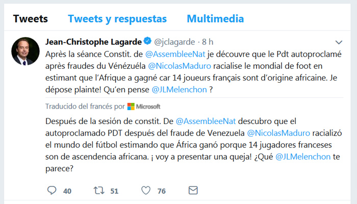 Un diputado francés, Jean-Christophe Lagarde, anunció este martes que presentará una denuncia por incitación al odio racial contra el presidente venezolano Nicolás Maduro, que el lunes dijo que el triunfo de Francia en el Mundial de fútbol era el triunfo de África.
