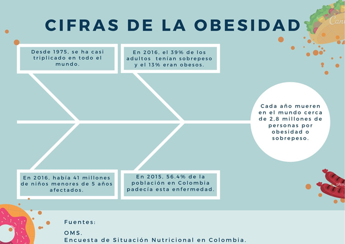 Resultados de la Encuesta de Situación Nutricional en Colombia de 2010 revelaron que el 51,2% de la población colombiana presentaba exceso de peso. Cinco años después, en 2015, esta misma medición confirmó que ya el 56,4% padecía de sobrepeso u obesidad.