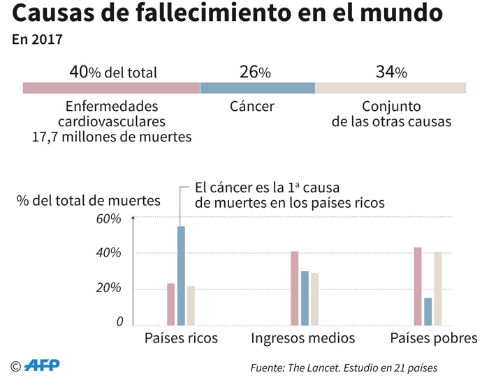 Las enfermedades cardíacas representaron más de 40% de las muertes, es decir, unos 17,7 millones de muertes en 2017, seguidas del cáncer, con 26% de los fallecimientos.