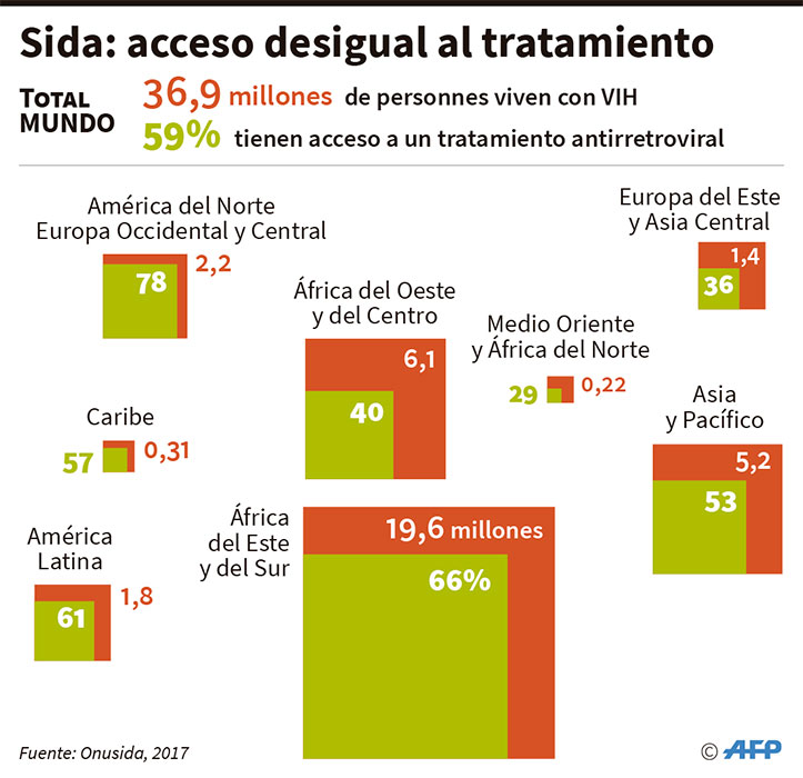 En 2017, 21,7 millones de personas tenían acceso (frente a 19,4 millones en 2016), de un total de 36,9 millones infectadas (frente a 36,3 millones), según el informe publicado este miércoles por la instancia de la ONU encargada de la lucha contra la enfermedad.
