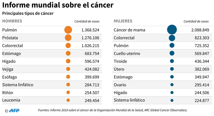 En 2018, la OMS registró en el mundo 18,1 millones de nuevos casos de cáncer y la organización vaticina que la cifra llegue de aquí a 2040 a entre 29 y 37 millones.