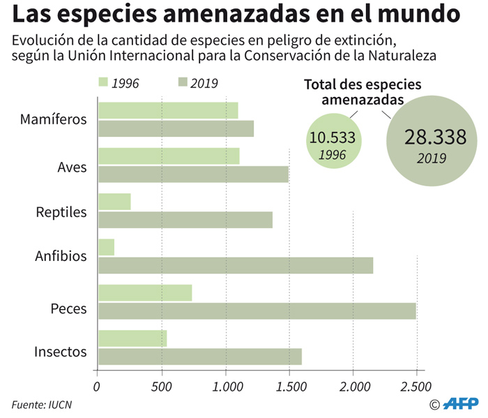 En ‘Lista Roja’ de la UICN hay 28.338 especies consideradas en riesgo de extinción.