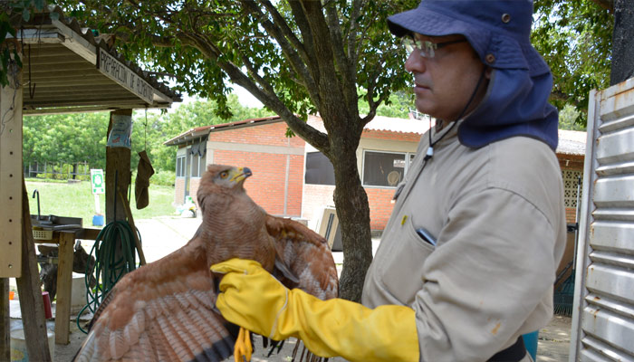Esta nueva moradora del hogar, conocida como águila sabanera, vivirá para siempre en cautiverio, encerrada en una jaula porque un campesino le disparó. Desde entonces vive sin una de sus alas.