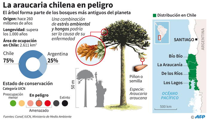 En los últimos años, los bosques de esta especie nativa del sur de Chile y Argentina se han reducido a unas 260.000 hectáreas solo en Chile, repartidas entre las cordilleras de los Andes y la de la costa o Nahuelbuta, las más amenazada, desde La Araucanía hasta Los Ríos.