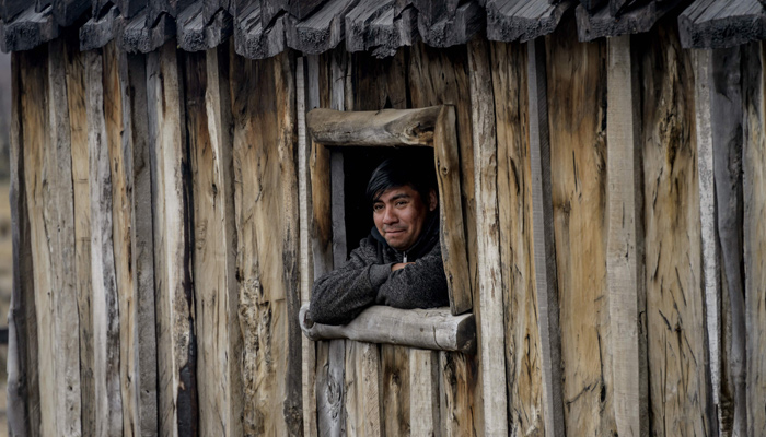 (El indígena mapuche Carlos Melinir mira por la ventana de una casa tradicional, donde se preparan platos tradicionales, que utilizan piñones, el fruto de la araucaria.)
