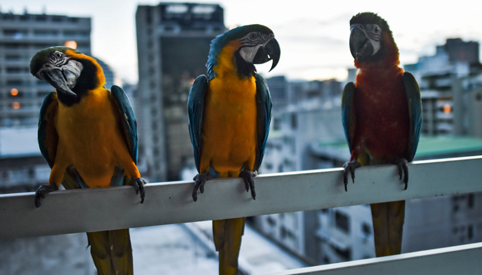 Coloridas guacamayas silvestres surcan el cielo de Caracas. Estridentes y mayormente dóciles, se posan en balcones en busca de alimento, una cercanía no siempre apropiada para su supervivencia.